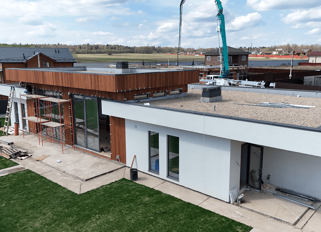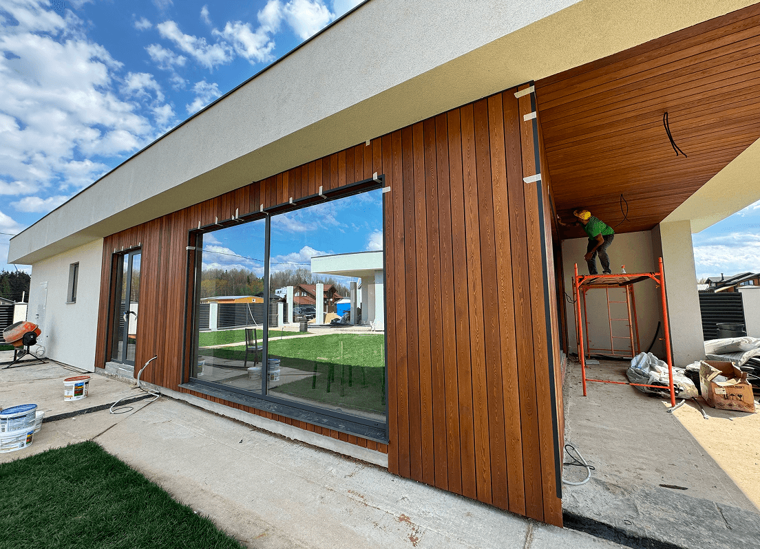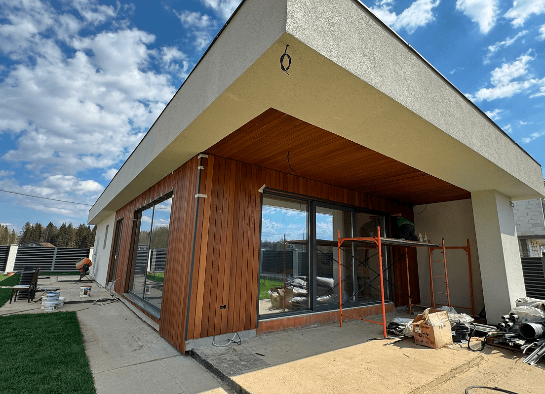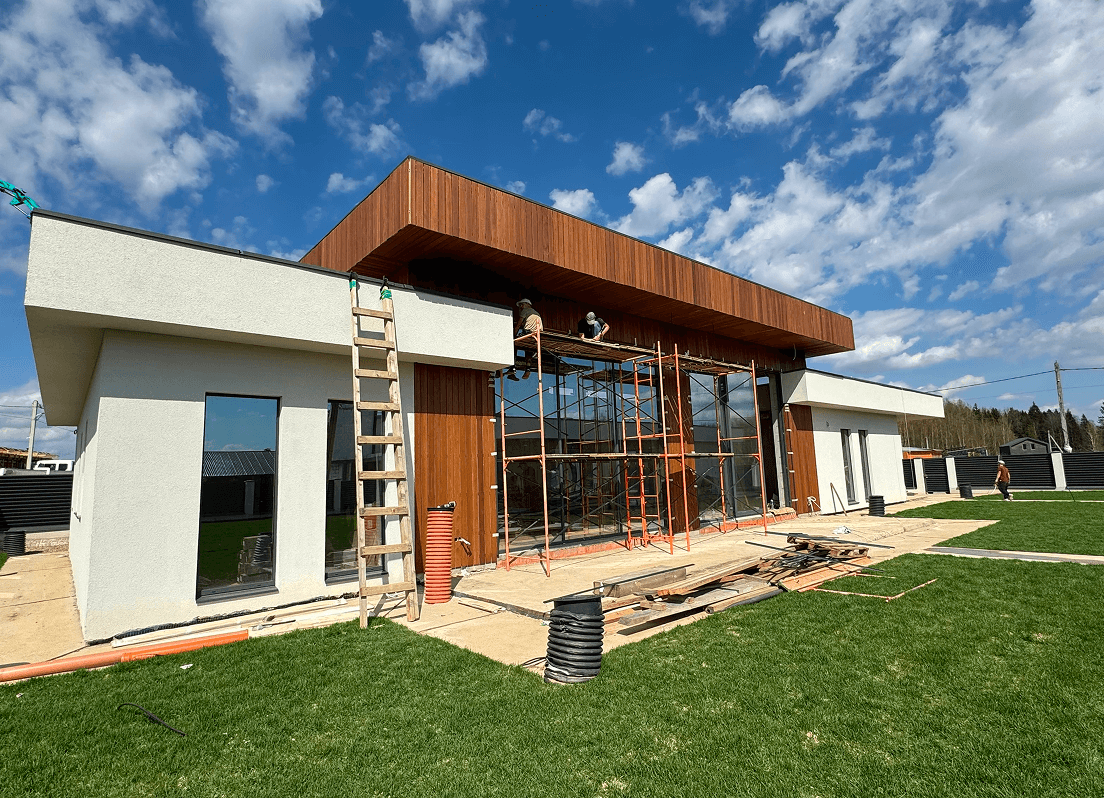 Дом и СПА комплекс. Комбинированный фасад с применением колированной штукатурки и планкен из термообработанной лиственницы