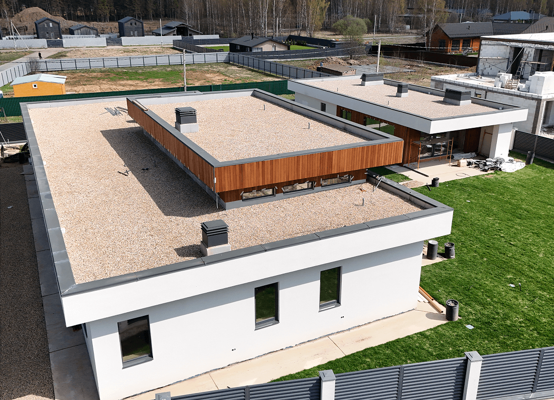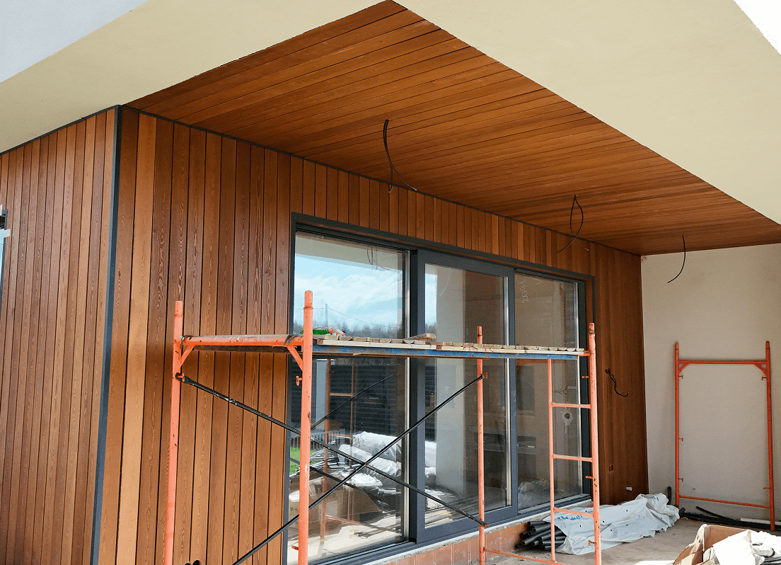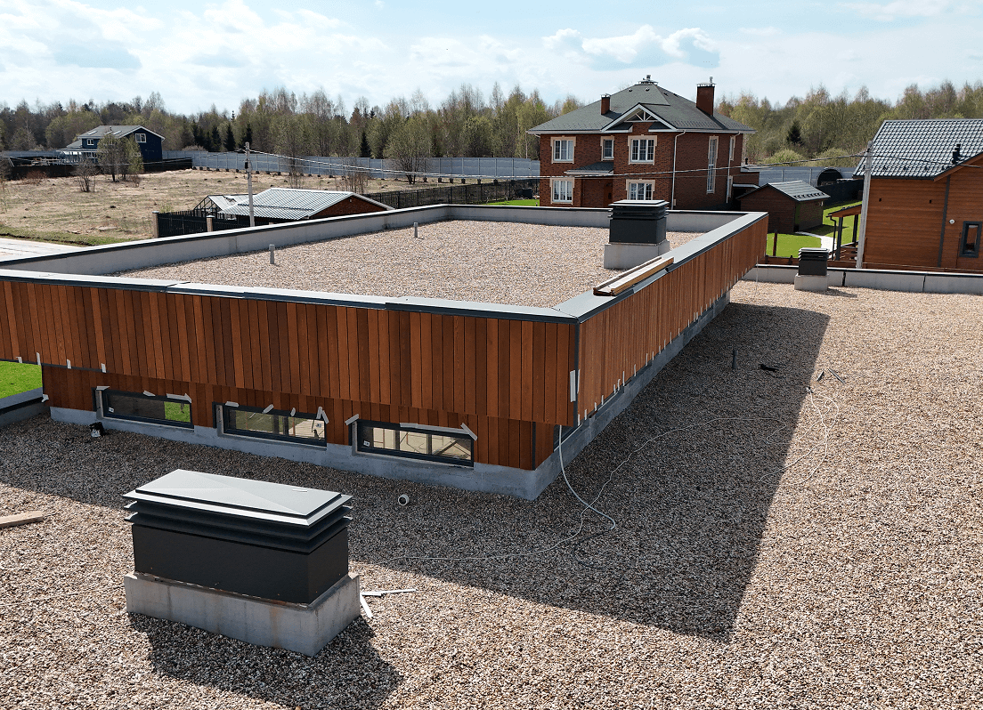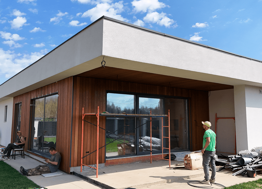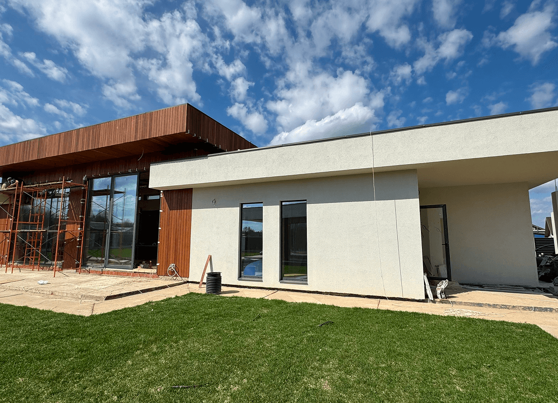 Дом и СПА комплекс. Комбинированный фасад с применением колированной штукатурки и планкен из термообработанной лиственницы